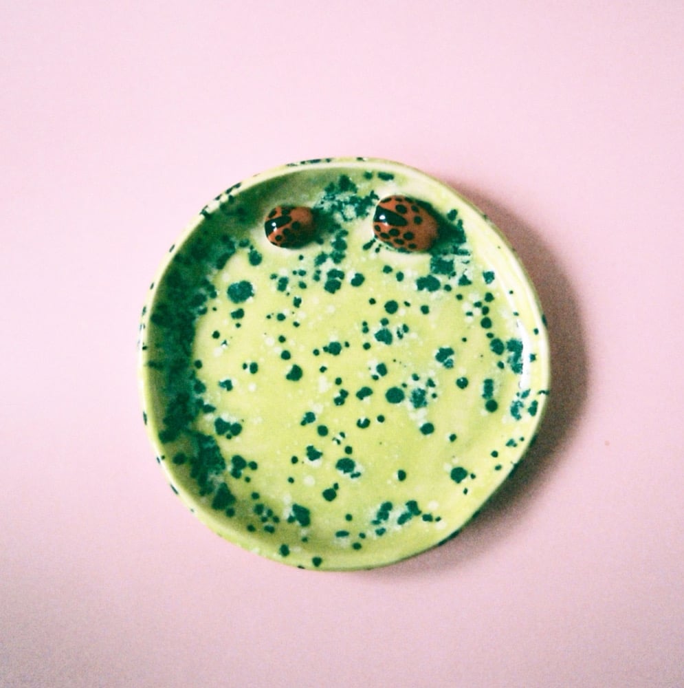 Hand built dish with hand painted ladybugs and green moss design. This dish is stoneware and has roughly a 13cm width.